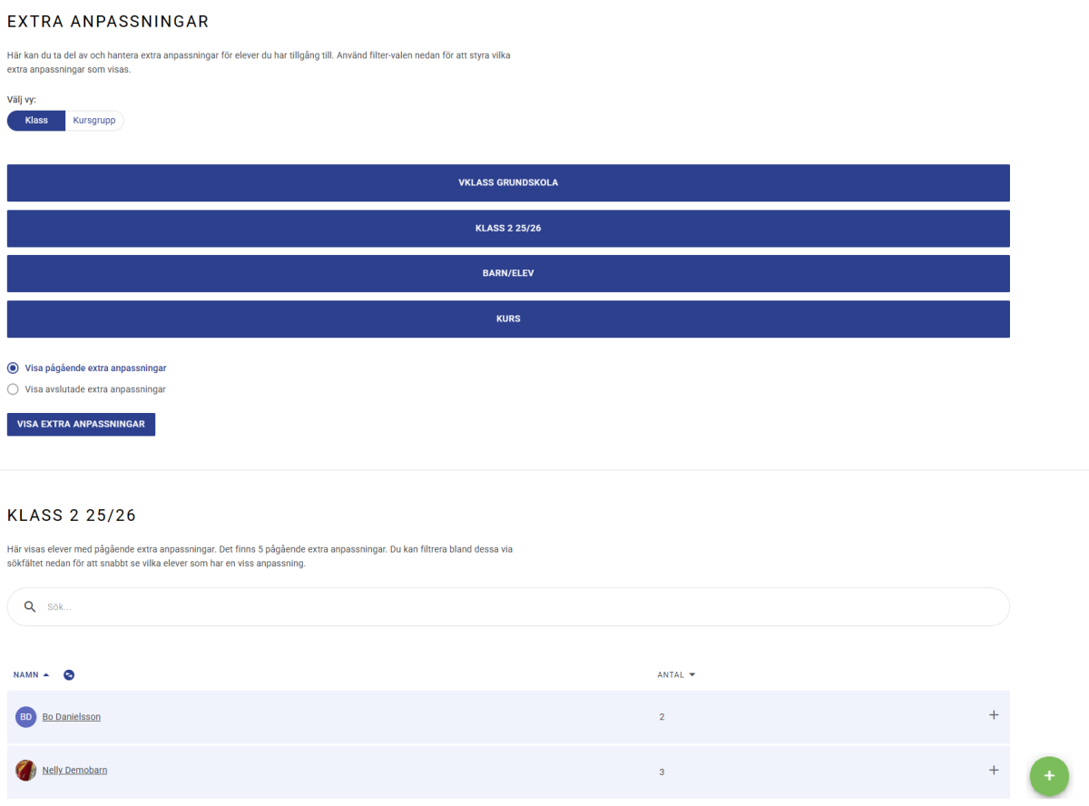 När man orienterat sig till Extra anpassningar, antingen via Elevstöd eller Grupper, har, den s.k., Landnings-/Startsidan följande skepnad.