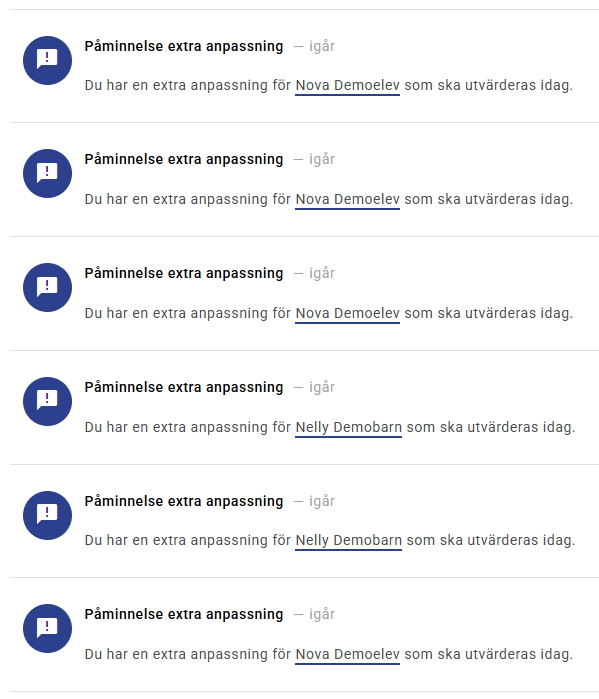 Händelsenotisen innebär att påminnelsen, om att utvärdera Extra anpassningen, signaleras, med en röd punkt 🔴 , i ikonen som har formen av en Ringklocka 🔔 .