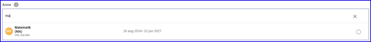 Val av Ämne fungerar på samma sätt som när man väljer Elev. Dvs. Enligt följande två varianter.