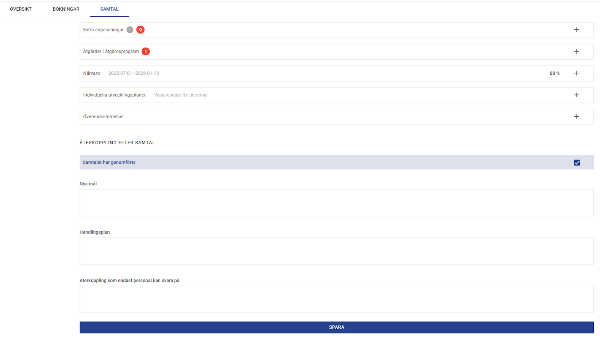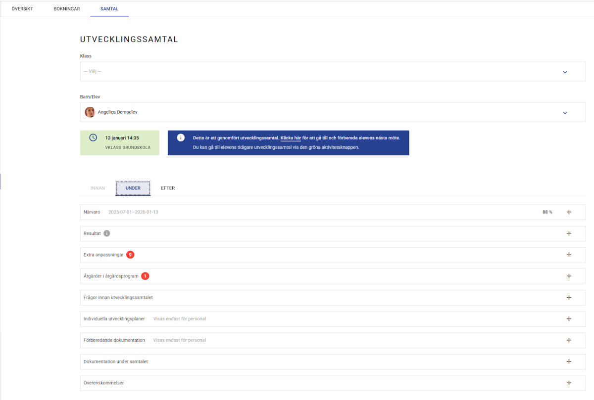 - Dokumentation under samtalet: Här dokumenteras de punkter ni diskuterar. För att spara tid kan läraren kopiera över sin förberedande dokumentation (från Innan-fliken) direkt till samtalsöversikten.
